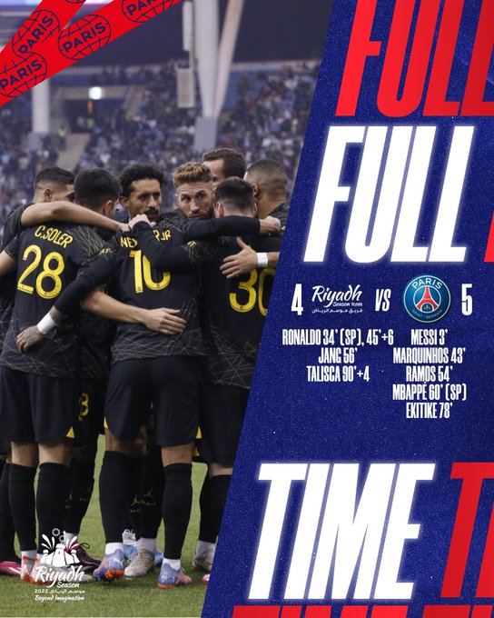 Fin de ce #PSGRiyadhSeasonTeam ! ✅ Le Paris Saint-Germain s'impose en clôture du #PSGQatarTour2023. ❤️💙 ⚽️ Leo Messi ⚽️ @marquinhos_m5 ⚽️ @SergioRamos ⚽️ @KMbappe ⚽️ @hekitike9