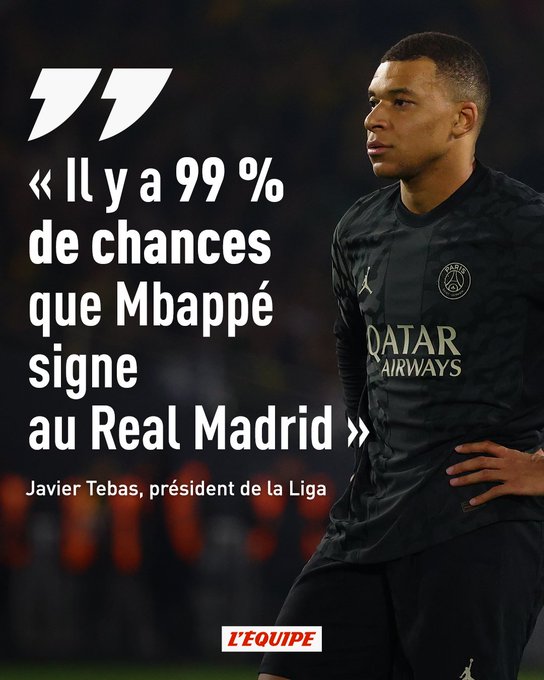 Javier Tebas, le président de la Liga, confirme que le Real Madrid est en pole pour engager Kylian Mbappé. Et sans avoir besoin de vendre le moindre joueur pour rester financièrement dans les clous ow.ly/YGoL50QHbSj
