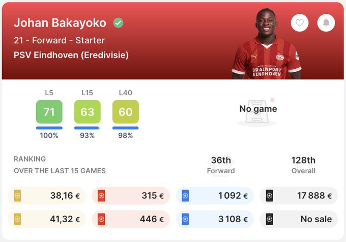Johan Bakayoko réalise une belle saison avec le PSV ! On pourrait bien avoir un Doku à gauche et un Bakayoko à droite. 2 flèches pour servir sur un pleteau Lukaku Grosse concu quand même Probabilité d'être à l'Euro : 99% Probabilité d'être titulaire : 65%