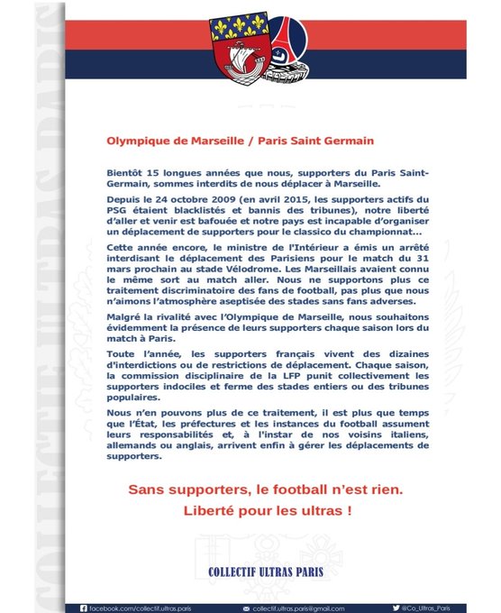 « Bientôt 15 longues années que nous, supporters du Paris Saint-Germain, sommes interdits de nous déplacer à Marseille, a écrit le principal groupe de fans du PSG. Depuis le 24 octobre 2009 (en avril 2015, les supporters actifs du PSG étaient blacklistés et bannis des tribunes), notre liberté d'aller et venir est bafouée et notre pays est incapable d'organiser un déplacement de supporters pour le Clasico du championnat... Cette année encore, le ministre de l'Intérieur a émis un arrêté interdisant le déplacement des Parisiens pour le match du 31 mars prochain au stade Vélodrome. »