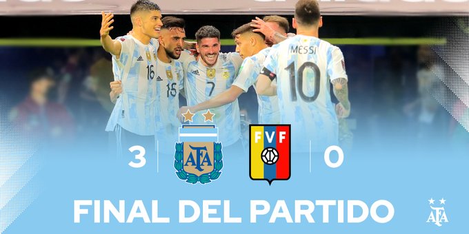 🏆 #Eliminatorias ⚽ @Argentina 🇦🇷 3 (Nicolás González, Ángel Di María y Lionel Messi) 🆚 #Venezuela 🇻🇪 0 👉 ¡Final del partido en La Bombonera! 🔜 El elenco comandado por Lionel Scaloni jugará el próximo martes ante #Ecuador 🇪🇨 ¡#VamosArgentina! 💪