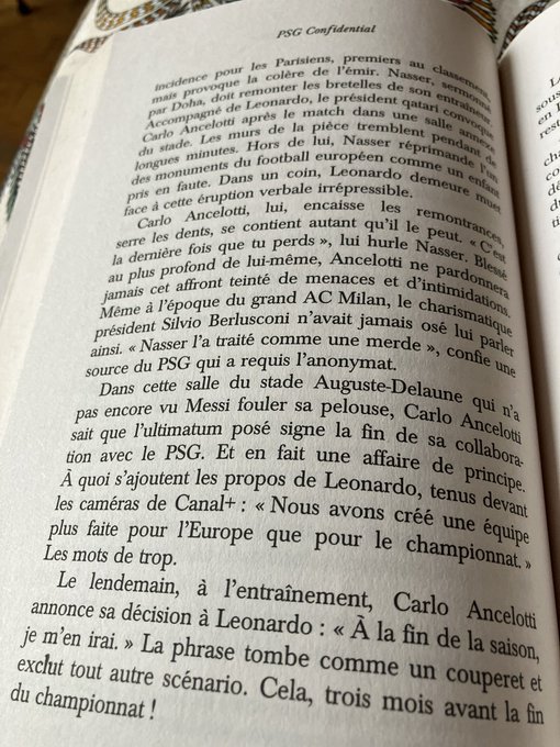 #PSGCONFIDENTIAL Quand Carlo Ancelotti, vainqueur hier d’une 5e ligue des champions comme entraîneur, se faisait sermonner «comme un enfant » par Nasser al-Khelaïfi à l’issue d’un match sans enjeu. Une altercation qui précipitait le départ de « Don Carlo »du PSG. @Valdiguie
