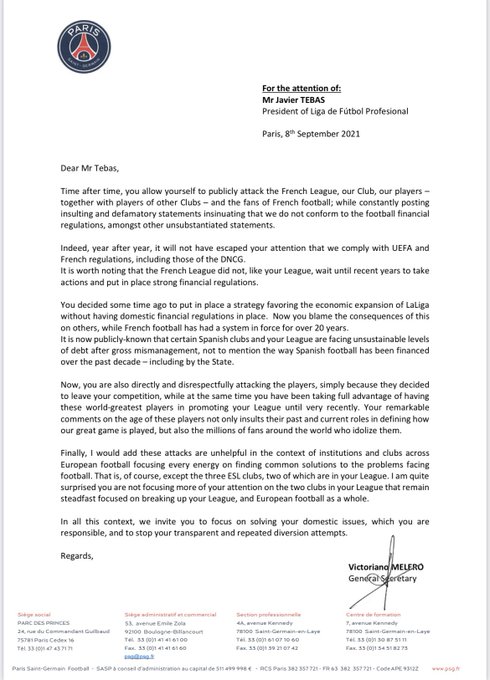 Dans une lettre recommandée envoyée par le Paris Saint-Germain au président de la Liga, le club de la capitale, via son secrétaire général Victoriano Melero, a appelé ce dernier à baisser d’un ton. « Cher Monsieur Tebas, vous vous permettez d’attaquer publiquement le Championnat de France, notre club, nos joueurs – et des joueurs d’autres formations – mais aussi les amoureux du football français, en faisant sans cesse des remarques insultantes et diffamatoires insinuant que nous ne respectons pas les règles économiques qui régissent le football, et d’autres sorties non fondées. Année après année, il ne vous a pas échappé que nous nous conformons pourtant aux régulations de l’UEFA et de la France, notamment celles de la DNCG. Il est d’ailleurs utile de souligner que la LFP n’a pas, contrairement à votre Ligue, attendu ces dernières années pour prendre des mesures et mettre en place un fort contrôle financier. Il est de notoriété publique que certains clubs espagnols et que votre Ligue sont confrontés à des niveaux d'endettement insoutenables après une mauvaise gestion flagrante, sans parler de la manière dont le football espagnol a été financé au cours de la dernière décennie – y compris par l'État. Désormais vous attaquez aussi directement et de manière irrespectueuse les joueurs, juste parce qu’ils ont décidé de quitter votre championnat », rétorque le PSG, qui fait également remarquer au patron de la Liga qu’il a déjà bien du mal à tenir en respect les clubs qui veulent créer une Super League. Et boum.