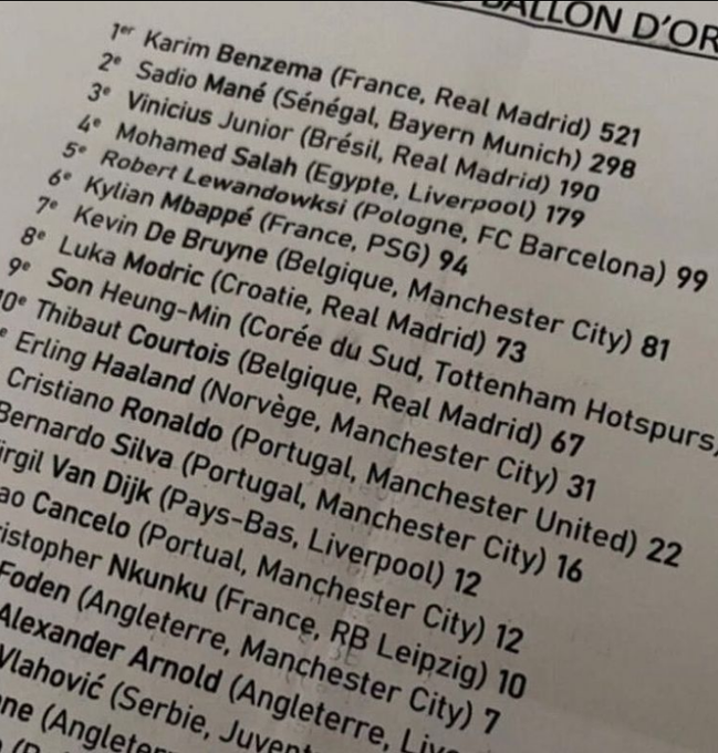 le classement du Ballon d’Or 2022. Bien évidemment, du côté des organisateurs, on dit et répète que toutes ces fuites sont fausses et qu’à ce jour personne ne peut prétendre avoir accès à une telle information. Mais selon ce document, Karim Benzema sera Ballon d’Or avec 521 points devant Sadio Mané, le joueur sénégalais désormais au Bayern Munich ayant 298 points, tandis que Vinicius Jr complète le podium avec 190 points. Pour trouver trace de Kylian Mbappé, il faut descendre à la sixième place, le joueur de l’équipe de France et du PSG n’ayant « que » 94 points. De quoi faire jubiler la presse espagnole, toujours en mode revancharde.