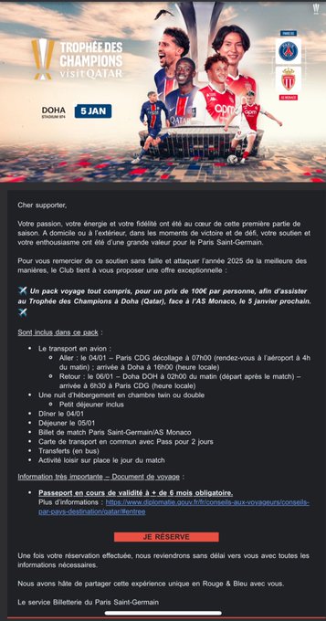 🔴🔵 Le club a envoyé par mail une offre à ses abonnés les plus fidèles pour le Trophée des Champions, qui se disputera à Doha le 5 janvier. ✈️🇶🇦