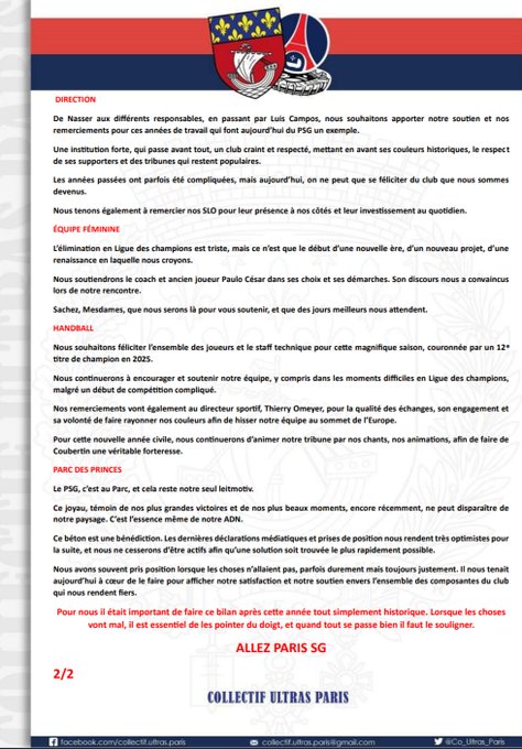 À noter qu’en plus de cet avertissement, le CUP a réaffirmé son souhait de voir le PSG perdurer au Parc des Princes dans le futur. Du côté des points positifs, le collectif a félicité les joueurs, le staff et les dirigeants pour l’année écoulée. Conscient des défis à venir et des difficultés rencontrées à Paris en ce début de saison, le CUP promet un soutien indéfectible, peu importe les résultats.