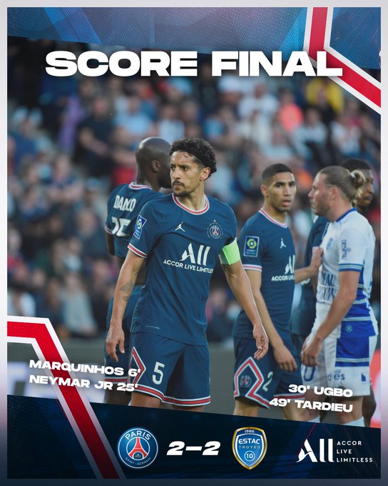 ⌛️ C'est terminé ! Score de parité au Parc des Princes @PSG_inside 2⃣ - 2⃣ @estac_officiel ⚽️ @marquinhos_m5 6' ⚽️ @neymarjr 25' #𝐏𝐒𝐆𝐄𝐒𝐓𝐀𝐂
