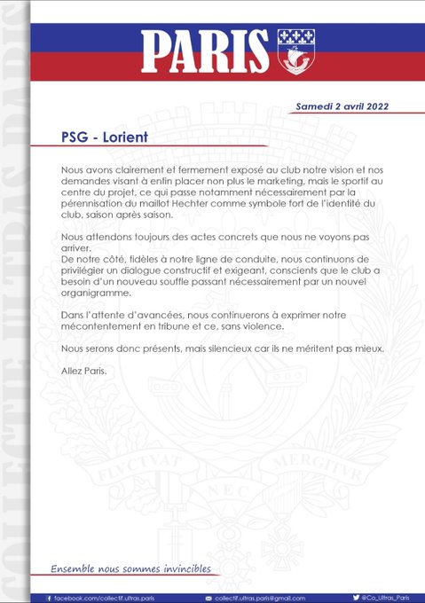 Pour les supporters du PSG, il devient indispensable que du côté de Doha on prenne en compte leurs demandes. « Nous avons clairement et fermement exposé au club notre vision et nos demandes visant à enfin placer non plus le marketing, mais le sportif au centre du projet, ce qui passe notamment nécessairement par la pérennisation du maillot Hechter comme symbole fort de l'identité du club, saison après saison. Nous attendons toujours des actes concrets que nous ne voyons pas arriver. De notre côté, fidèles à notre ligne de conduite, nous continuons de privilégier un dialogue constructif et exigeant, conscients que le club a besoin d'un nouveau souffle passant nécessairement par un nouvel organigramme. Dans l'attente d'avancées, nous continuerons à exprimer notre mécontentement en tribune et ce, sans violence. Nous serons donc présents, mais silencieux car ils ne méritent pas mieux. Allez Paris », indique le CUP, qui réclame toujours, le départ de Leonardo et de Nasser Al-Khelaifi.