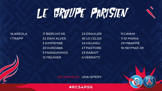 Le groupe parisien pour défier le @RCSA demain après-midi à La Meinau ! 👊 ⚽️ #RCSAPSG 🔴🔵 #AllezParis