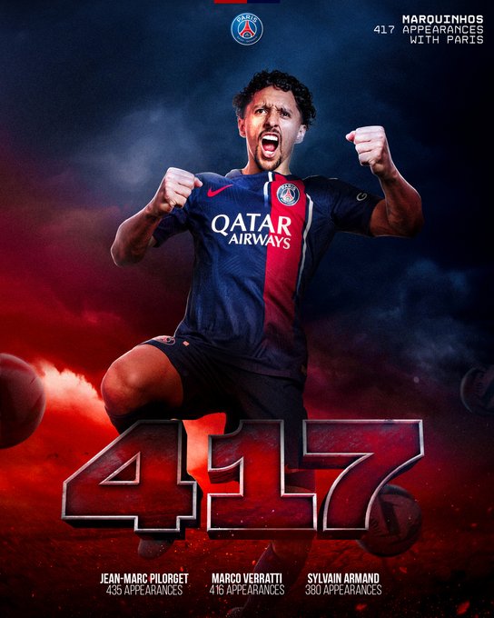 𝟒𝟏𝟕e match de @marquinhos_m5 ce soir sous les couleurs du Paris Saint-Germain ! ❤️💙 Marquinhos devient le second joueur le plus capé de l’histoire du club, toutes compétitions confondues.