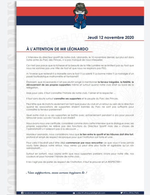 « Peut-être que 46 matchs seulement en tant que joueur du club et un retour au sein de la direction quand les associations de supporters étaient bannies du Parc ne sont pas suffisants pour connaître la ferveur parisienne ? (…) Monsieur Leonardo, nous considérons que le lien entre le sportif et les tribunes doit être fort, profond et empli de respect réciproque pour que l’institution soit forte et unie. Pour cela, il faudrait peut-être déjà commencer par nous rencontrer, ce que vous n’avez jamais voulu faire depuis votre retour. Vous verrez que ça peut être plus facile et agréable qu’un rendez-vous administratif » pestent les supporters, qui espèrent avoir l’occasion de rencontrer Leonardo dans les semaines à venir afin de tirer cette affaire au clair, alors que la polémique prend des proportions assez importantes à Paris.