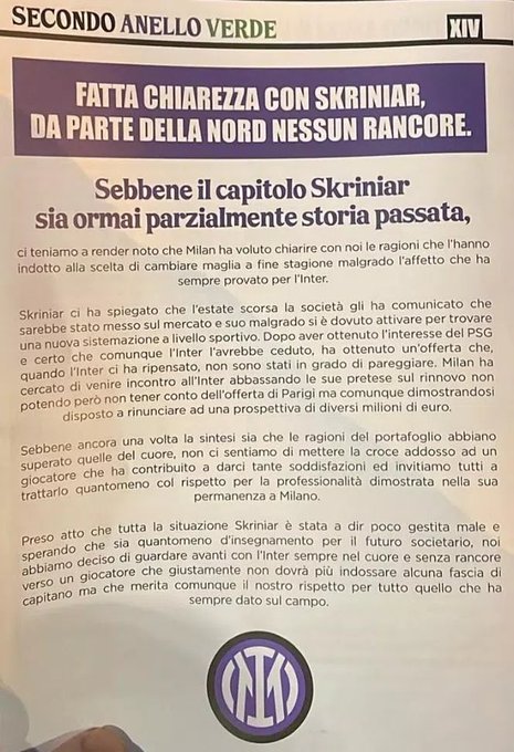 « Même si le chapitre Skriniar est désormais en partie passé, nous tenons tout de même à faire savoir que Milan a tenu à clarifier avec nous les raisons qui l'ont poussé à changer de maillot en fin de saison, malgré l'affection qu'il a toujours témoignée à l'Inter. Skriniar nous a expliqué que l'été dernier, le club lui avait dit qu'il serait mis sur le marché et contre son gré, il devrait travailler pour se trouver un nouveau club. Après avoir reçu l'intérêt du PSG et certain que l'Inter allait le vendre, il a reçu une offre du PSG qui, une fois que l'Inter a changé d'avis, son club n'a pas pu être égalée. Milan a tenté de baisser ses demandes de prolongation de contrat et s'est tourné vers l'Inter pour les aider, étant même prêt à renoncer à plusieurs millions d'euros. Alors si encore une fois en résumé les raisons du porte-monnaie ont surpassé celles du cœur, nous ne nous sentons toujours pas bien de crucifier un joueur qui a contribué à tant de belles réalisations, et nous invitons quiconque à faire preuve de respect pour le professionnalisme dont il a fait preuve durant son séjour à Milan. En regardant tout, il est juste de dire que toute la situation de Skriniar a été mal gérée et nous espérons qu'elle pourra au moins servir de leçon pour l'avenir de ce club. Nous avons décidé de regarder vers l'avenir avec l'Inter toujours dans nos cœurs et sans rancune envers un joueur qui, à juste titre, ne devrait plus porter le brassard de capitaine, mais mérite toujours notre respect pour avoir toujours donné le meilleur de lui-même sur le terrain », peut-on lire sur un pamphlet distribué au Stadio Meazza ces dernières heures. Un message rassurant pour Skriniar, qui va donc pouvoir se donner à fond jusqu’à la fin de la saison avant de potentiellement signer un gros contrat de 9 millions d’euros par an à Paris.