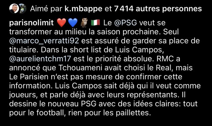 En effet, le compte Instagram @parisnolimit a relayé une information du Parisien qui confirmait qu'il n'y avait aucun accord entre le Real Madrid et Aurélien Tchouaméni, et que Campos avait visiblement le souhait de faire venir le joueur monégasque lors de ce mercato. Et ce message a été liké par....Kylian Mbappé en personne, ce qui n'a évidemment échappé à personne, les deux joueurs étant proches. De quoi forcément redonner de l'espoir aux supporters parisiens de voir le milieu de terrain de 22 ans débarquer au Parc ds Princes sous le maillot du PSG.