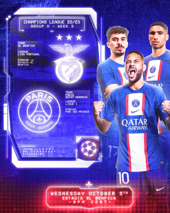 ⚽️ 𝗝𝗢𝗨𝗥 𝗗𝗘 𝗠𝗔𝗧𝗖𝗛 ⚽️ 🆚 @SLBenfica 🏆 @ChampionsLeague 📱 #SLBPSG ⌚️ 21h 🔴 #AllezParis 🔵