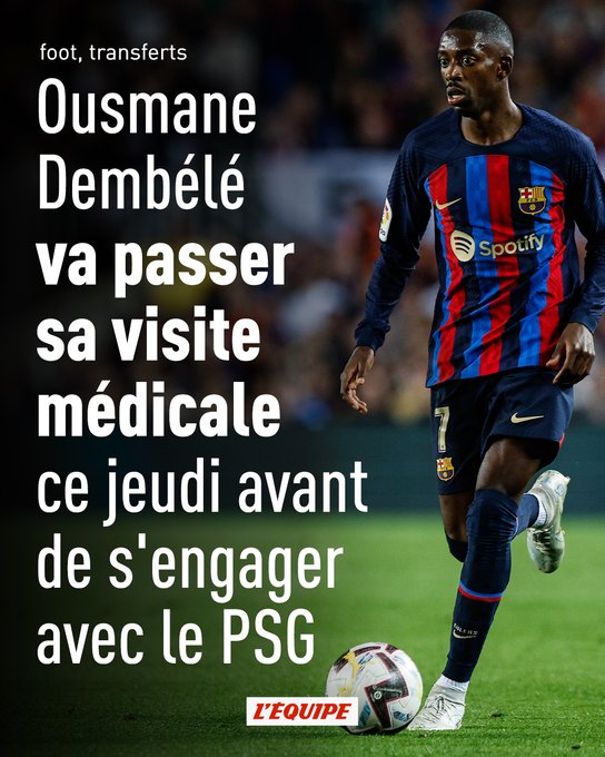 L'attaquant international français de Barcelone Ousmane Dembélé va enfin s'engager avec le PSG pour une durée de cinq ans après avoir passé au préalable sa visite médicale ce jeudi : ow.ly/IjKY50Pw8Wn