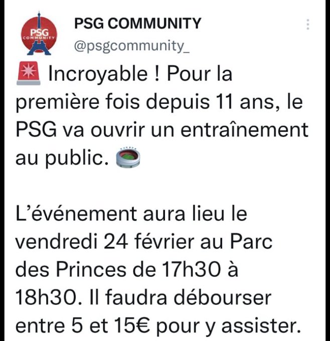 « Seuls, en groupe ou en famille, vous êtes attendus le vendredi 24 février à partir de 16h pour venir encourager l’équipe dans leur enceinte historique et rivaliser avec la ferveur parisienne qui fait la réputation du Parc des Princes les jours de match », a écrit le Paris Saint-Germain, dont les abonnés bénéficient de deux places gratuites, en plus d’une priorité d’achat pour deux places supplémentaires. Quant aux autres, il leur faudra payer 5 à 15 euros la place pour une heure d’entraînement de 17h30 à 18h30.