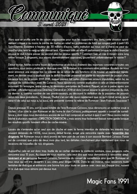 Et les Magic Fans 1991 de mettre les deux dirigeants au pied du mur. « Lassés de n'entendre qu'un seul son de cloche et avec la ferme intention de défendre les intérêts trop souvent délaissés de l'ASSE, nous avons, début février, exigé une rencontre rapide avec l'ensemble des dirigeants. Mr Romeyer nous a alors promis de faire part de ce vœu à son associé Bernard Caïazzo. Force est de constater que près de deux mois plus tard, les défaites s'enchaînent plus rapidement que nous ne recevons de nouvelles de nos dirigeants. Aujourd'hui cela en est donc trop. Inutile de se cacher derrière le contexte sanitaire, nous exigeons cette rencontre sous 15 jours. Au risque de nous répéter, cela veut dire que nous demandons à rencontrer simultanément et en personne Bernard Caïazzo, l'ensemble du conseil de surveillance ainsi que Mr Romeyer et tous ceux qui ont été désignés à ses côtés pour diriger l'ASSE. Dans le cas inverse, nous cesserons toute tentative de dialogue et entrerons une bonne fois pour toute en guerre avec ceux qui, chaque jour, nuisent à ce club que nous aimons par-dessus tout », écrivent les Magic Fans 1991, qui ne se contenteront pas d’une visio-conférence depuis Dubaï avec Bernard Caïazzo.