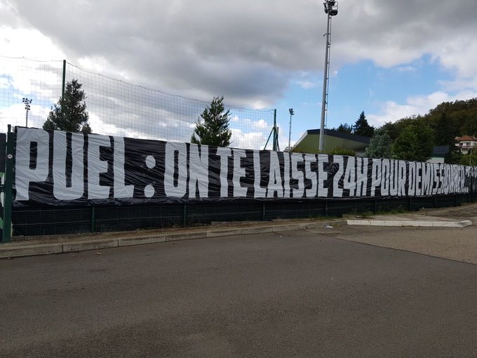 « Puel : on te laisse 24 heures pour démissionner ». La banderole a été accrochée sur les grilles du centre d’entraînement de l’ASSE. #ASSESCO