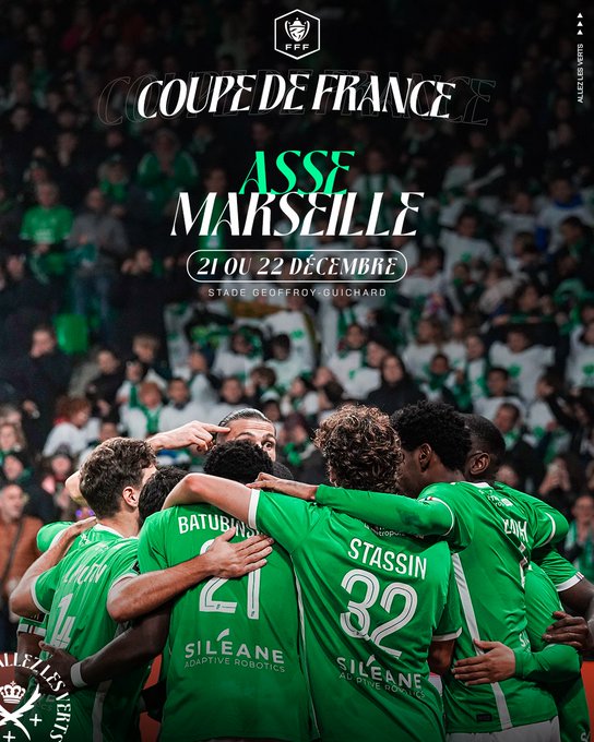 🏆 Du très lourd, d'entrée, en Coupe de France 🇫🇷 ! Pour son 32e de finale, l’ASSE accueillera l’@OM_Officiel au Stade Geoffroy-Guichard ! 🏠