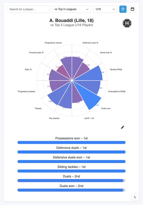🇲🇦🇫🇷 Ayyoub Bouaddi vs Top 5 League U19 Players 🥇 Possessions won – 1st 🥇 Defensive duels – 1st 🥇 Defensive duels won – 1st 🥇 Sliding tackles – 1st 🥈 Duels – 2nd 🥈 Duels won – 2nd 💎 datamb.football/A_Bouaddi_Midf…
