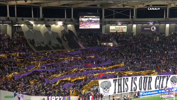 "This is our city", le tifo version Peaky Blinders des supporteurs du @ToulouseFC avant #TFCOM sur @canalplus ! 😎