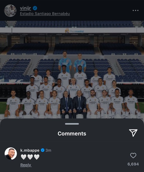 Kylian Mbappé sous le post Instagram de Vinicius : « 🤍🤍🤍 »