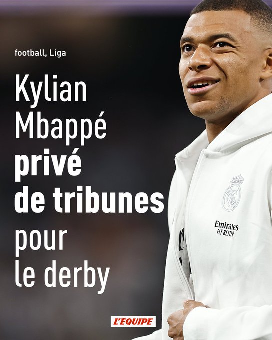 Faute de pouvoir disputer le derby contre l'Atlético ce dimanche, Kylian Mbappé, en convalescence, espérait être présent au stade Metropolitano pour supporter ses coéquipers. Le Real l'en a dissuadé ow.ly/2Q5350Ty1Ts
